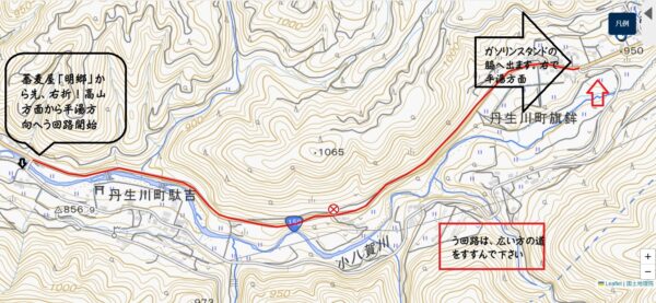 高山市街から平湯方面への道が一部通行止めになっています。う回路があります、そちらを使ってください。う回路では分かれ道があったら、広い方を選んでください。明郷というそばやを過ぎたあたりから、う回路に入ります。う回路の出たところは、ガソリンスタンドです。